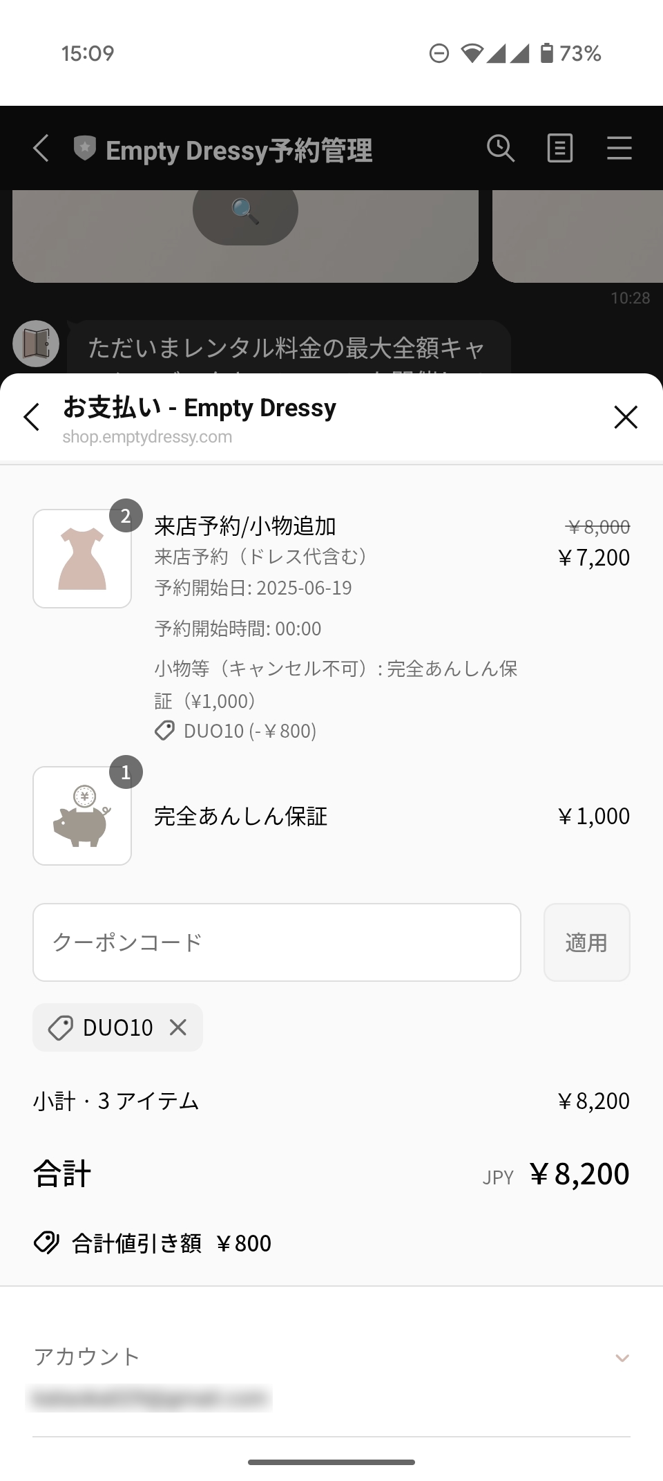 それぞれのクーポンコードに必要な人数分「来店予約(ドレス代含む)」を追加し、お支払い画面でクーポンコードを入力し、「適用」をタップします。