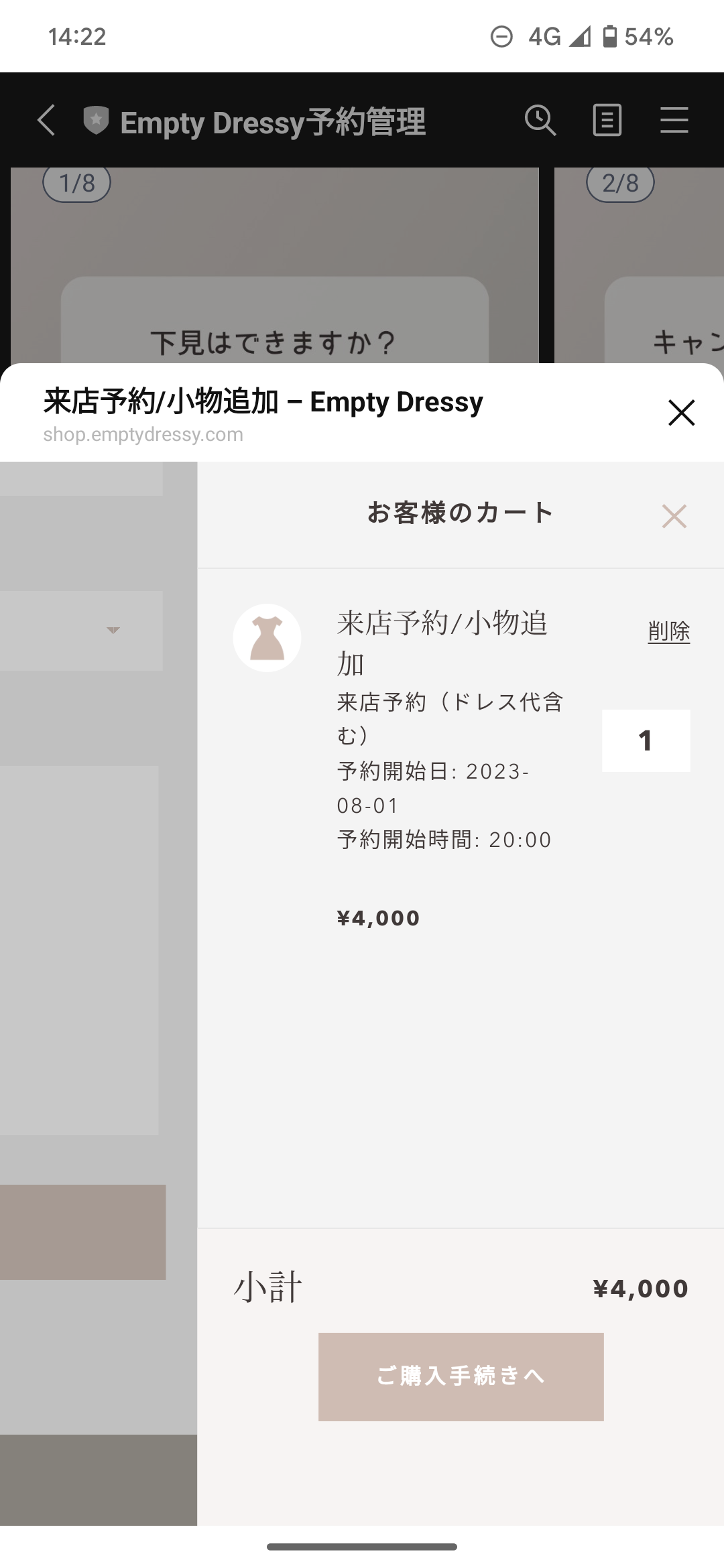 カートには、来店予約の4,000円に加え、小物の代金が加算されます。