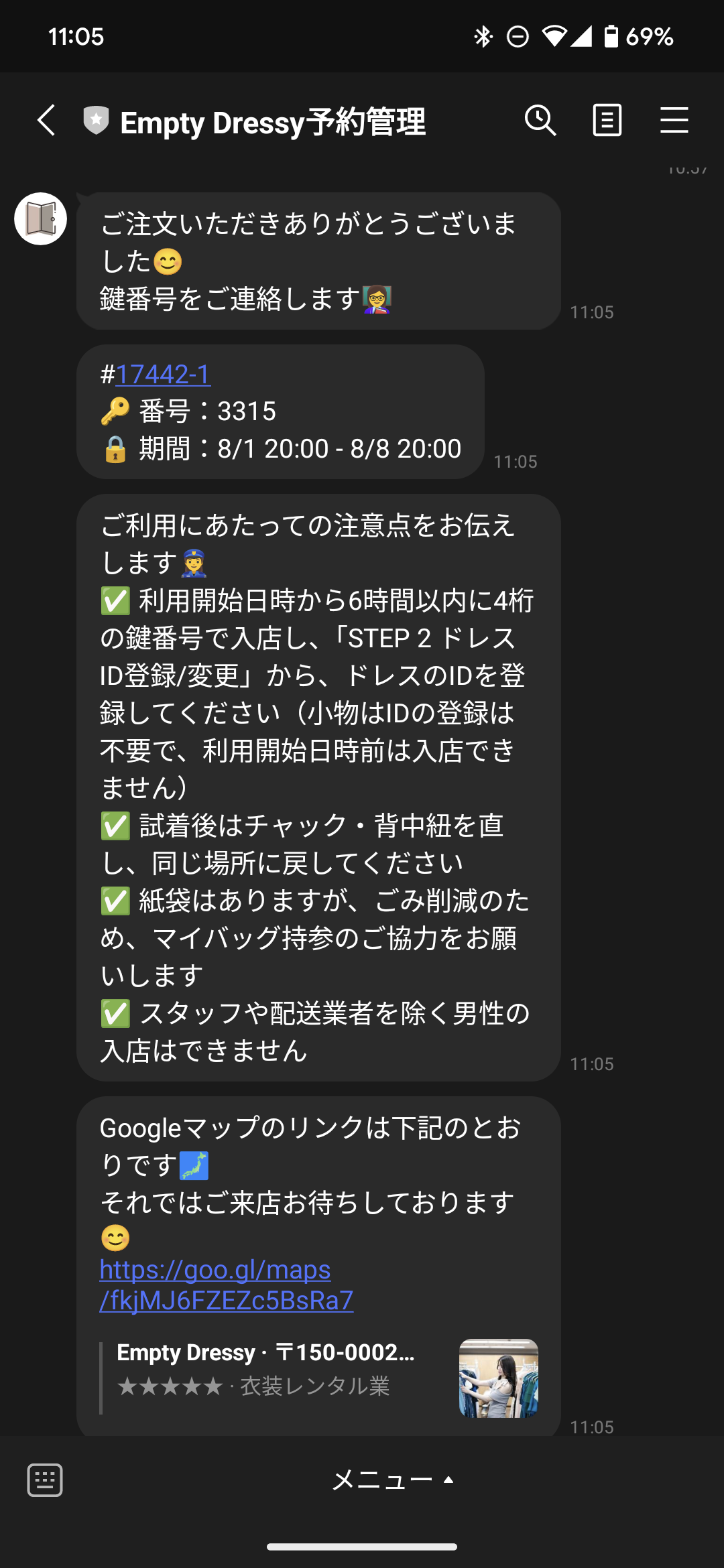 LINEから、「予約期間延長/開始日変更」を押すと、鍵番号や来店予約時間を確認することができます。