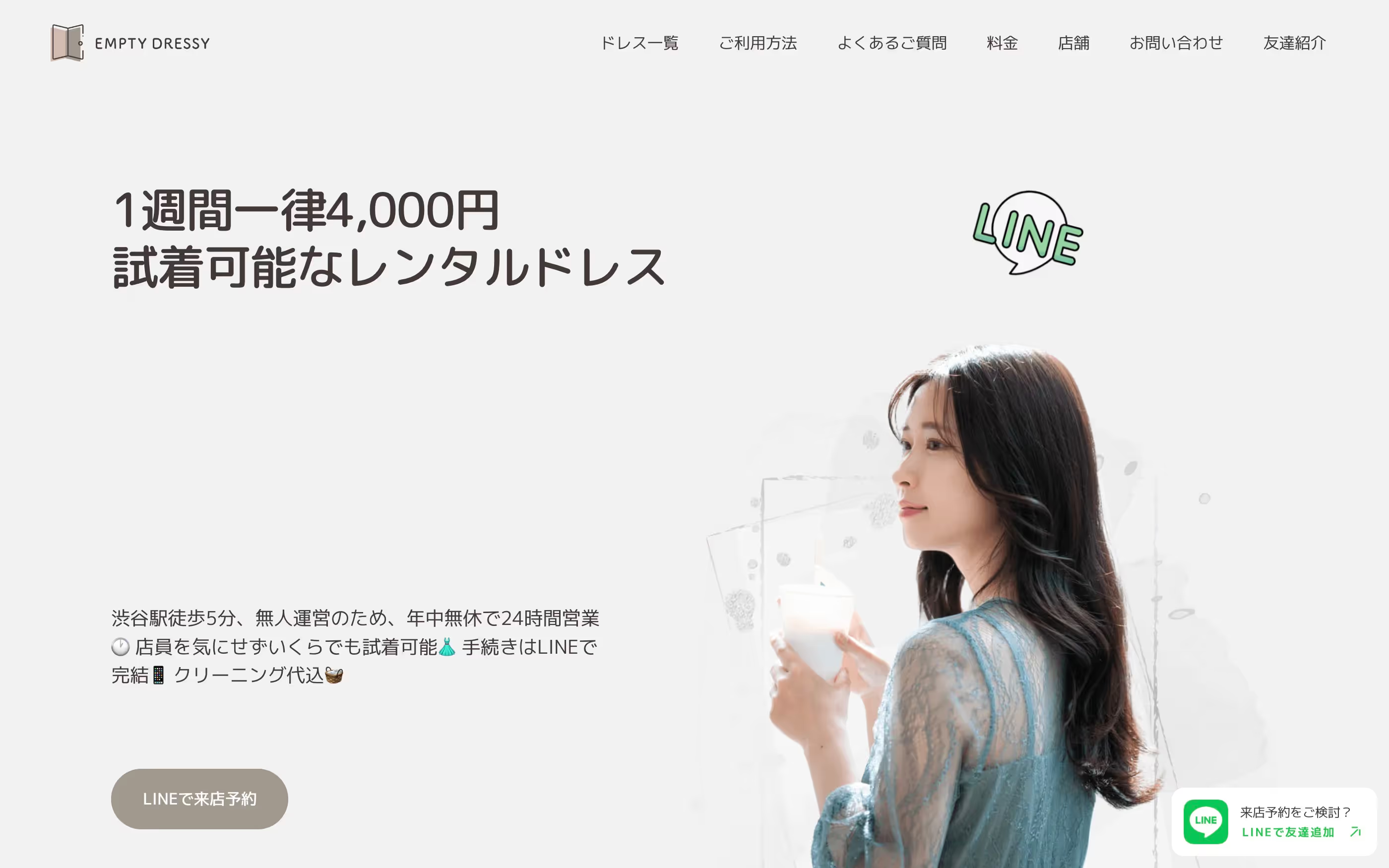 Empty Dressyは、渋谷にある無人のレンタルドレスショップで、実店舗はあるものの、店員がいないということが1番の特徴です。年中無休24時間営業で、試着室が9つあるため、好きな時間に試着ができます。