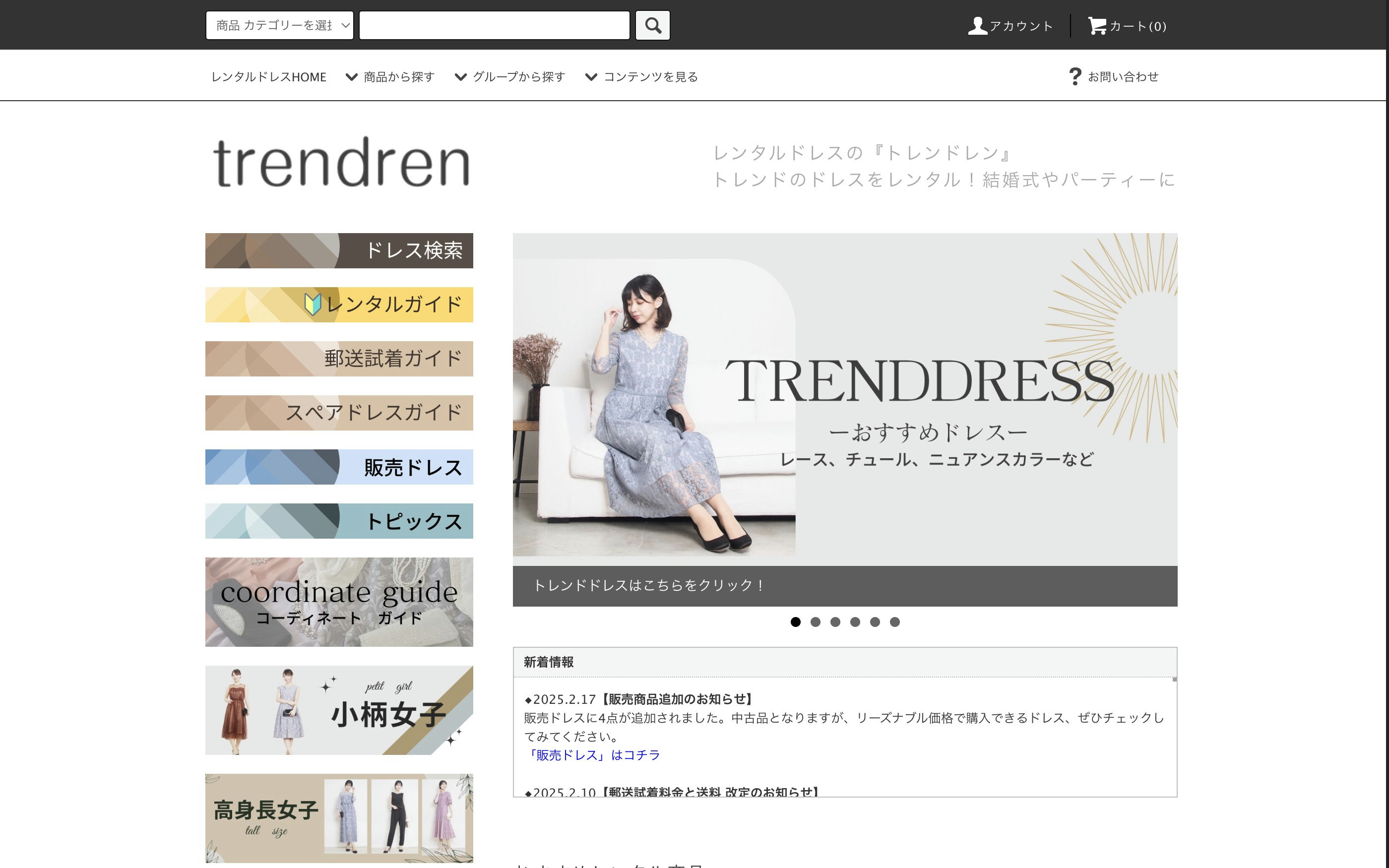 trendrenは、オンライン専業のレンタルドレスショップです。送料は別ですが、1回につき3着まで500円/着で試着できたり、1回につき1着まで500円で予備ドレスを同梱できたりと、オンラインストアの試着ができないという不安を取り除く企画をしています。