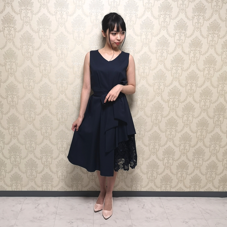 首元をすっきりキレイに魅せるVネックのワンピースです♪ スカート部分にボリュームを持たせて揺れ動くシルエットにして、大人なフィット&フレアーに仕上げました。 花柄の刺繍レースをスカートの片側に切替えて印象に残るニュアンスある一枚に♪