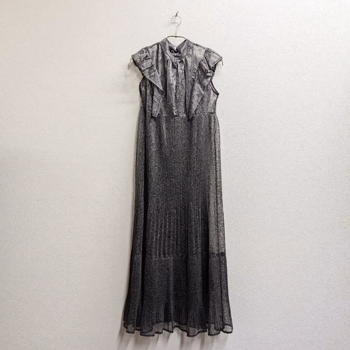袖のフリルとフラワーレースがピュアでフェアリーな印象を与える一着。 落ち感のあるストレートシルエットでスカートの透け感や分量にもこだわり動くたびにふわりと揺れるスカートも魅力の一つ細かいプリーツ加工はウエストから裾にかけて消しプリーツ加工でフレアな仕上がりに。