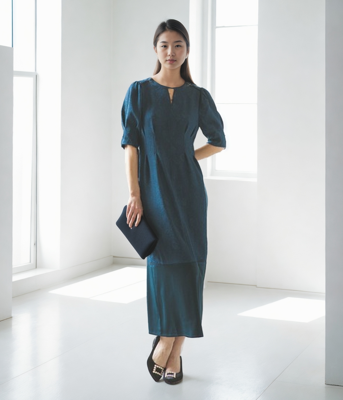 ジャガード素材とコクーンシルエットが大人っぽさを感じさせるドレス。 ナローなコクーンシルエットが身体のラインをすっきりと見せてくれ、洗練された印象へと導きます。 襟元はキーホールデザインをあしらい、トレンド感をプラス。 肩には配色のパイピングををあしらって、全体の雰囲気を引き締める要素に。