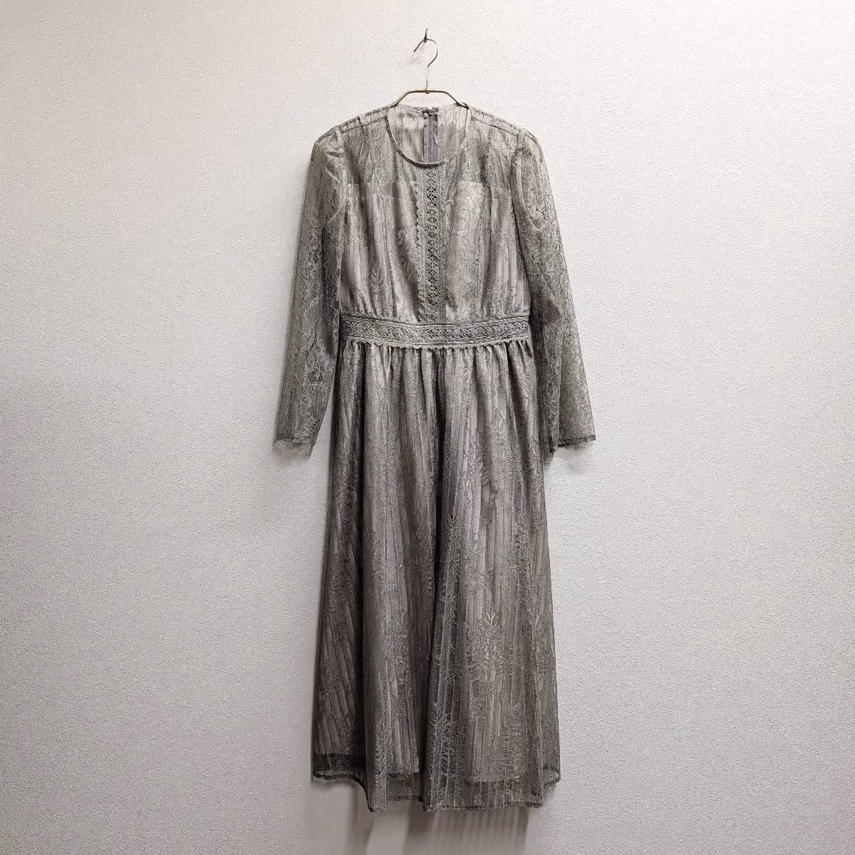 2種類のレースとテープレース使いがデザインアクセントの総レースワンピース。 ウエストと上身頃のレーステープがドレス全体を引き締めてくれます。 後ろウエストはゴム仕様で楽な着心地◎