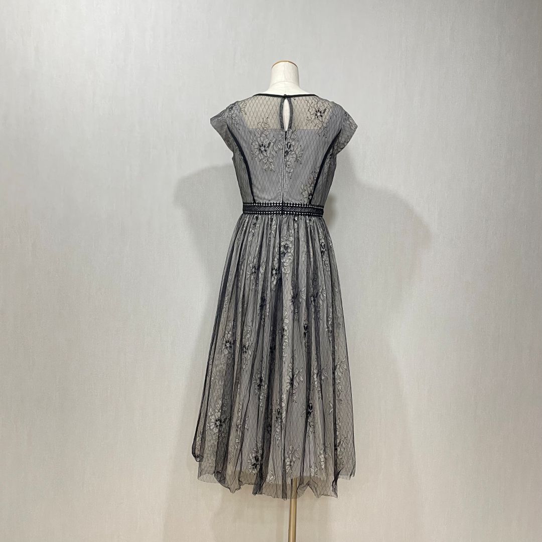 ダイヤ柄のチュールと花柄のチュールレースを重ねたエレガントなパーティードレス。ベースの生地とのコントラストとミモレ丈がとても上品です。ウエストの位置もやや高めなのでスタイルアップ効果もあります。