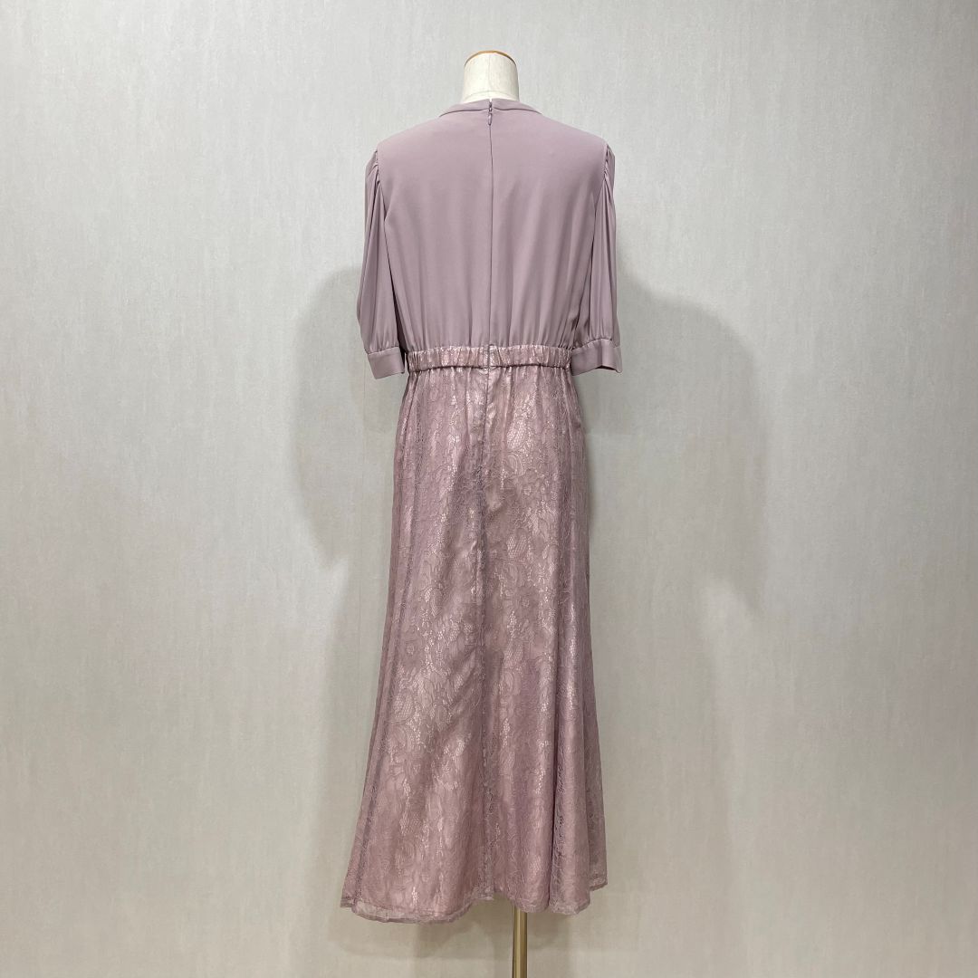 シフォンのブラウスとレースのスカートを組み合わせたデザインのマーメイドシルエットのドレスです。ブラウス部分はスタンドネックにギャザーのデザイン、袖はボリュームスリーブなので華やかな雰囲気にしてくれます。ウエスト部分は後ろがゴムになっているので長時間のご着用もストレスなくご使用いただけます。