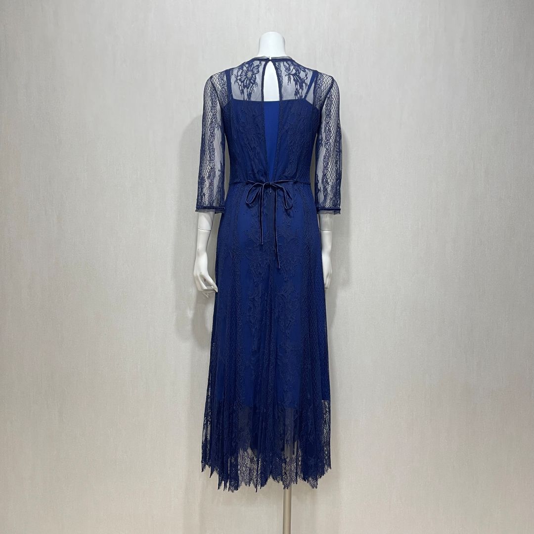 クラシカルな雰囲気のレースロングドレス☆ 首元と袖口にベロアテープと切りっぱなしのチュールを施し、細部までオシャレなドレスです♪ ウエストにベロアのリボンが付いているのでウエストを調節してよりスタイルアップなシルエットをつくることができます◎