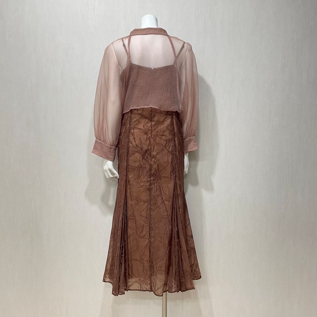 凹凸感のあるオーガンジートップスとフロッキー生地を使用したキャミソールワンピースがセットになった一着です。 トップスは前後どちらでもお使いいただける2WAY仕様になっています。 ボリュームのあるトップスに対して、すっきりとしたマーメイドシルエットのワンピースにすることで、メリハリがつきスタイルアップ効果◎
