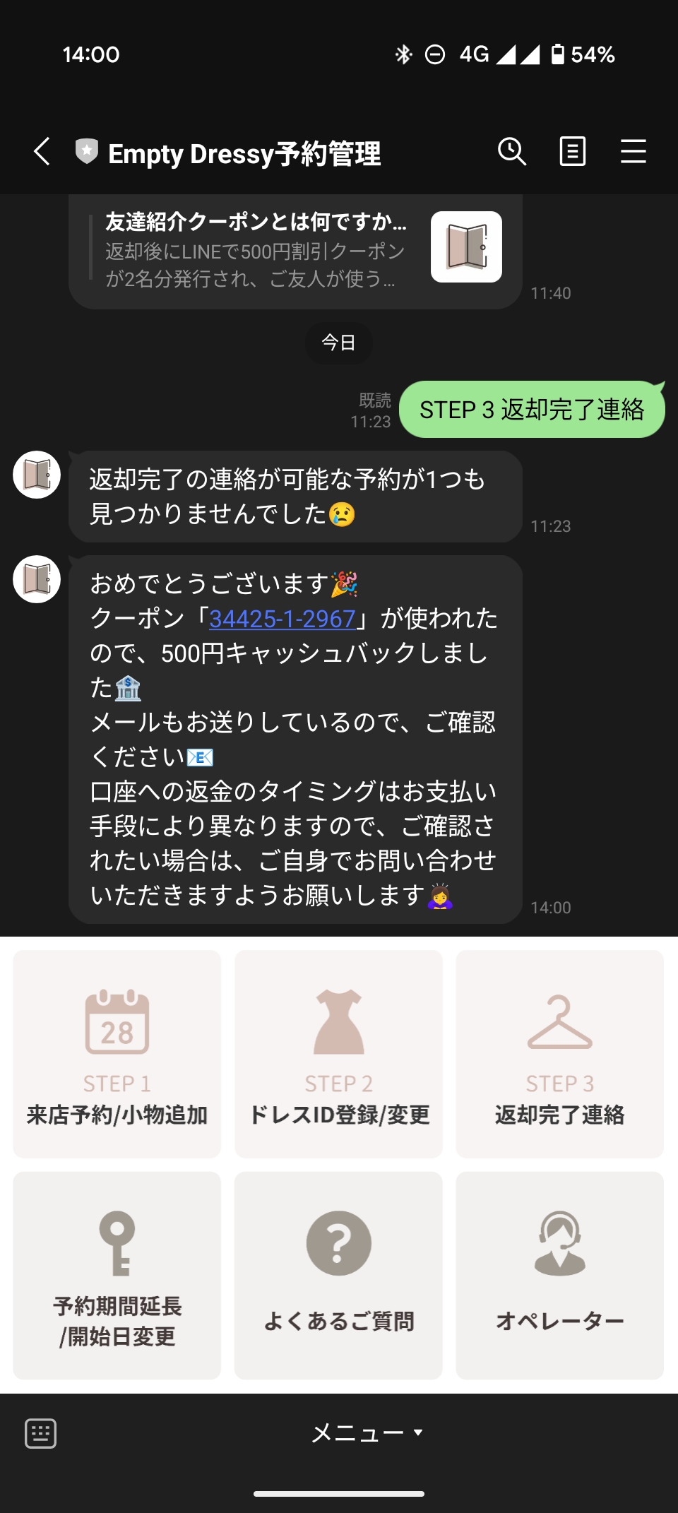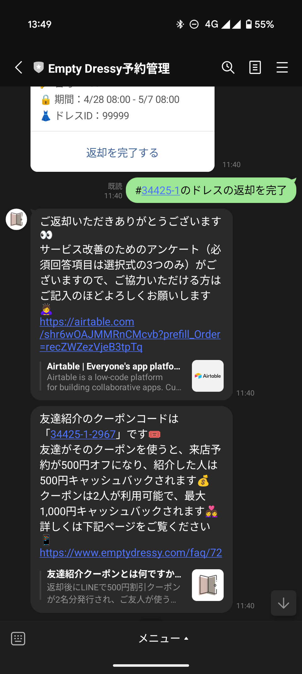 返却完了の連絡を行うと、友達紹介のクーポンコードがLINEで送られます。