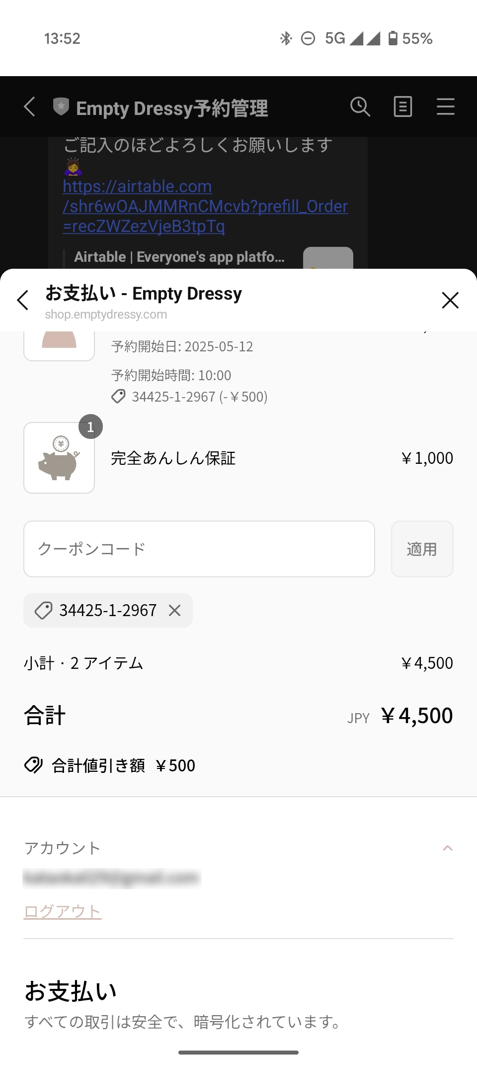 お支払い画面で、クーポンコードを入力し、「適用」をタップすると、500円オフの金額が表示されます。